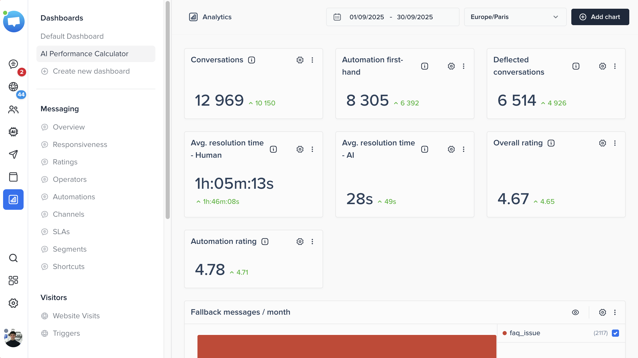 This gives you a full view of your AI’s performance: deflection rate, fallback rate, AI-resolved conversations, misunderstanding patterns, and time saved.